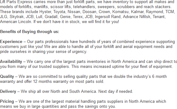 We have first-rate prices on all our lift truck parts. For a quote on an attachment or part we offer, please call us at: